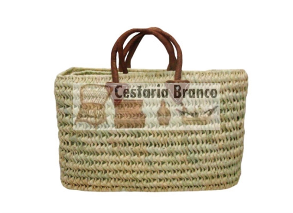 Mala retangular, rendada, em palma natural, asa em couro castanho, tam. Peq.